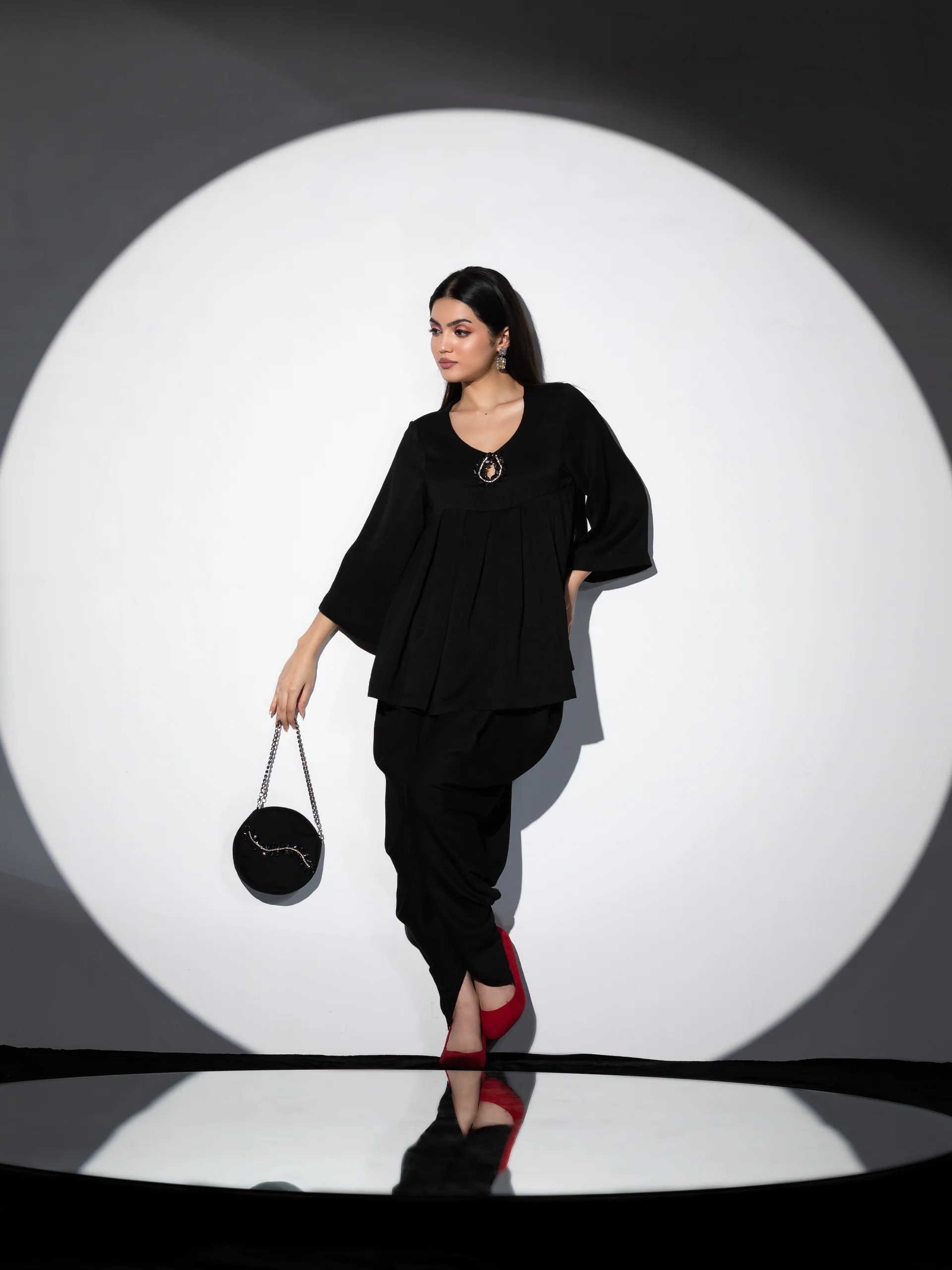 Women's Glass Keyhole Black Korean Top Set with Dhoti Pants 2 Piece Set | Straight Fit, Keyhole Neck, Full Sleeves, Dhoti Pants, Festive Wear, (Korean Fabric)
