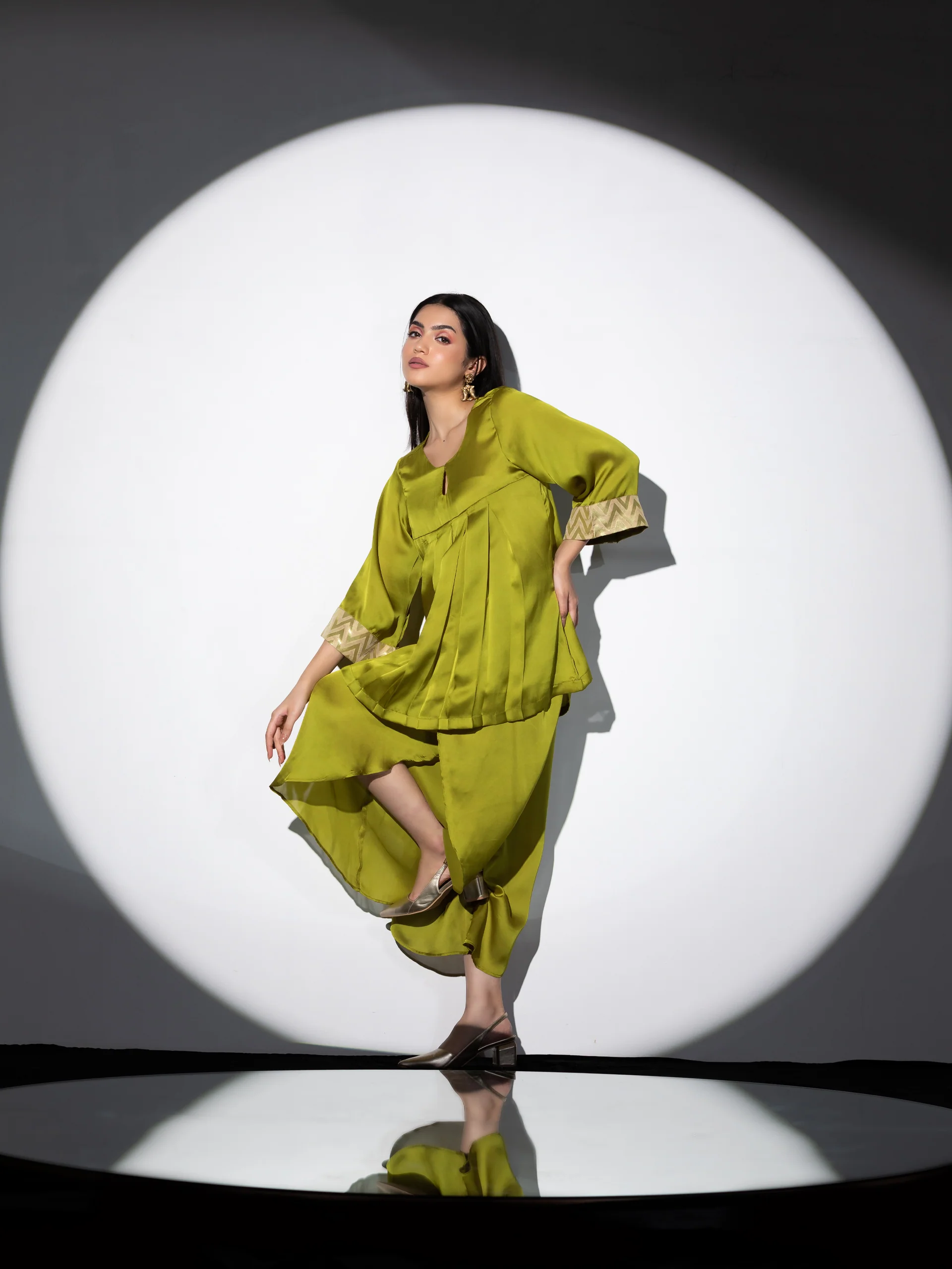 Top:- Fabric has a lux colour and drape of Satin which is a very soft and luxurious Lime color Co-ordinate in a unique colour which makes you feel absolutely gorgeous, especially with its pleated front, inner brocade cuff, and dhoti pant. It combines traditional elements with a touch of modern elegance.