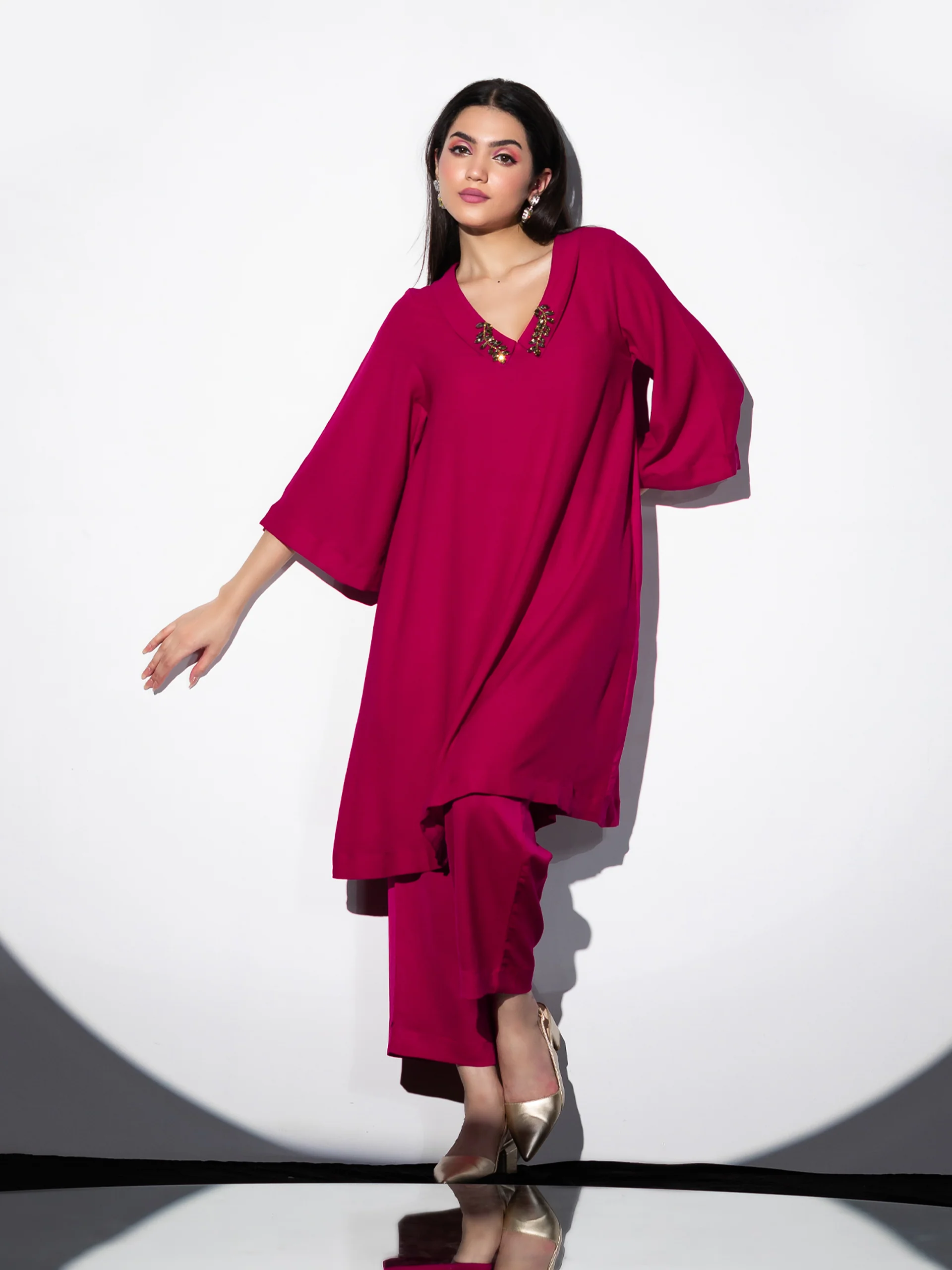 Top:- If you are looking for a stunning fashionable ethnic ensemble to make heads turn, the Korean Maroon Kurta with flare sleeves and handstitched Glass leaf glass embellishment on the neck is just the perfect pick. With its comfortable fit and unique design.