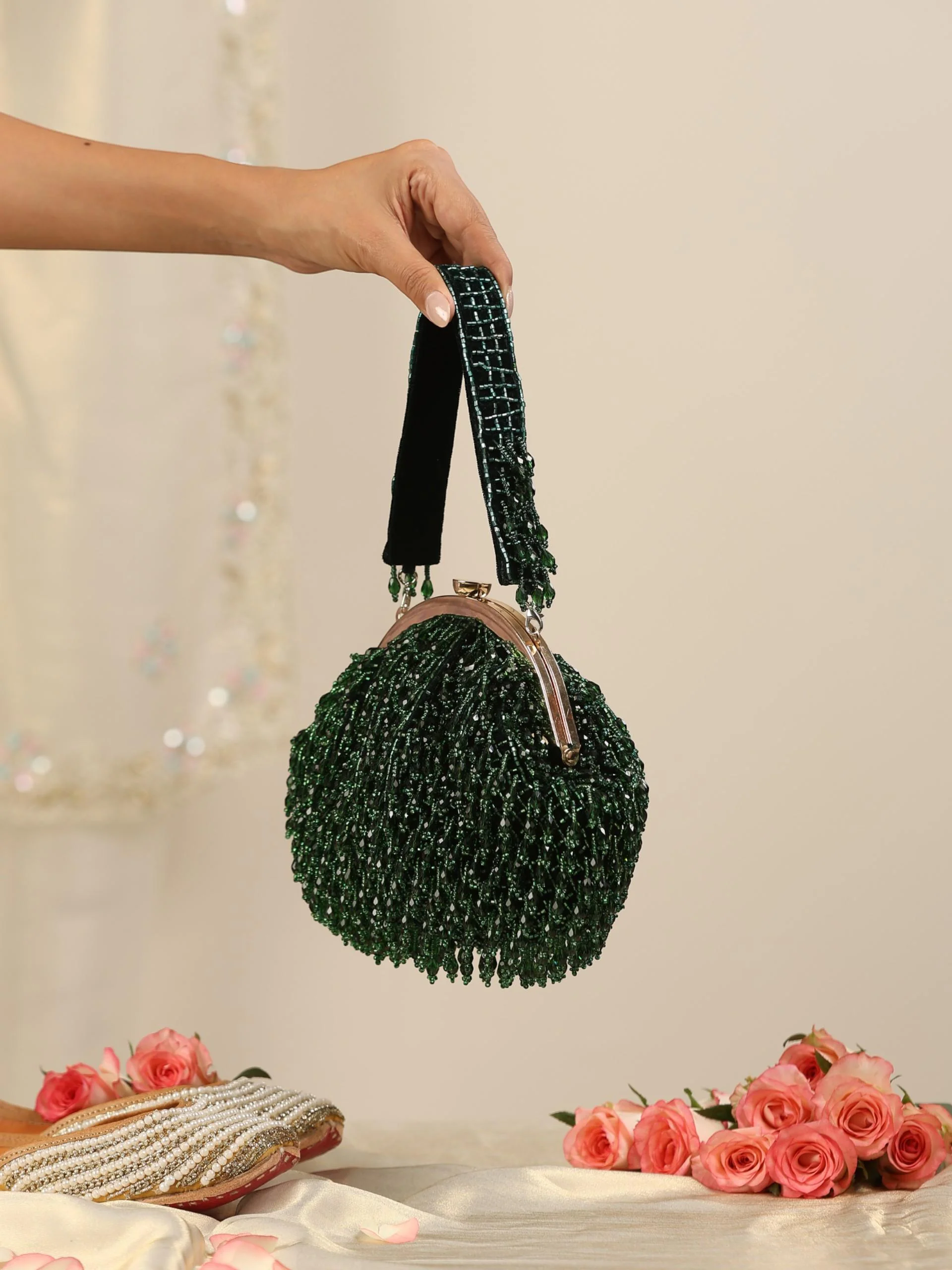 The handle, also embellished with green beads, complements the overall design and adds a cohesive touch to the clutch's luxurious appearance.