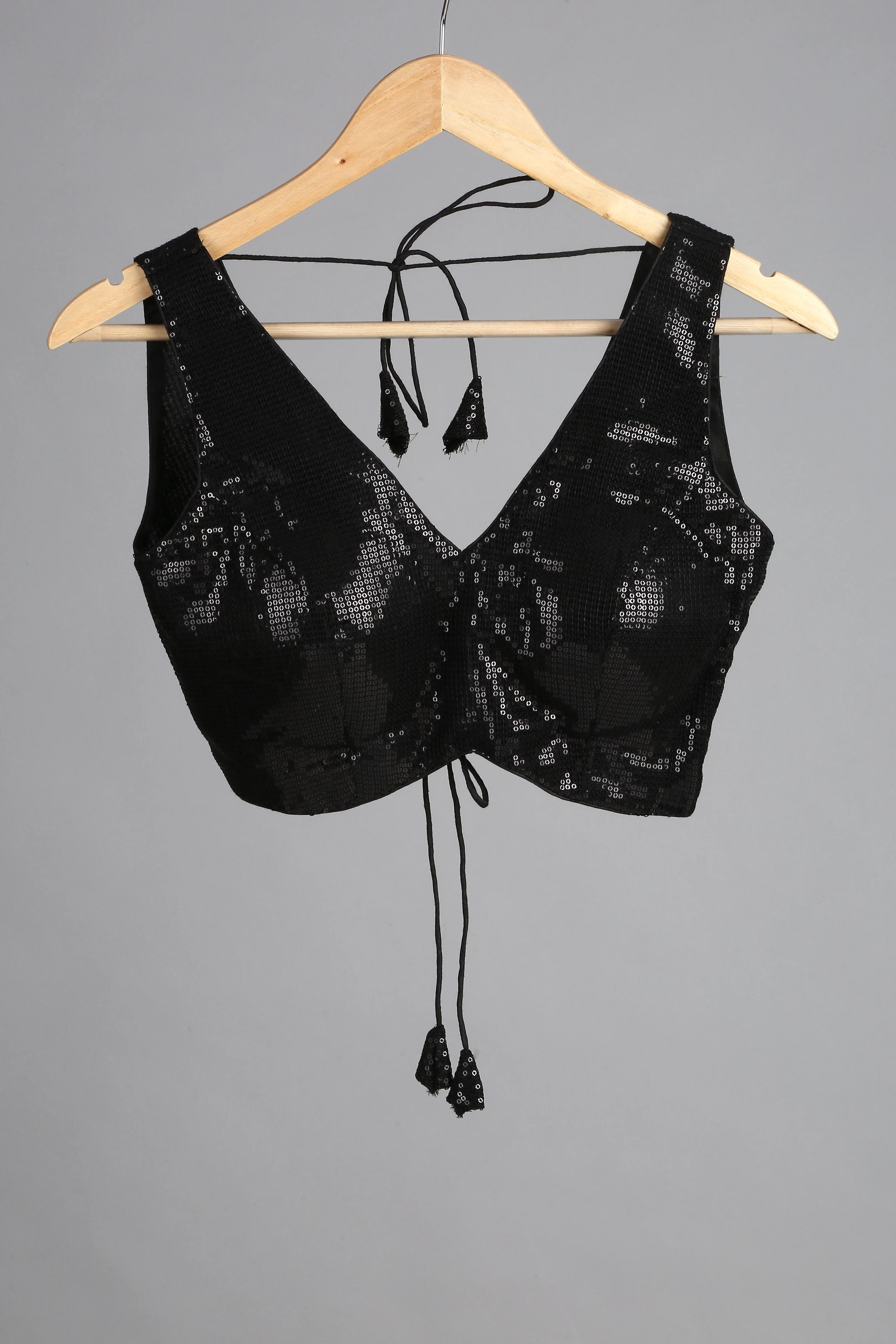 Description:- Black Sequin Deep V neck Blouse with Shoe lace style ties to tighten at the back