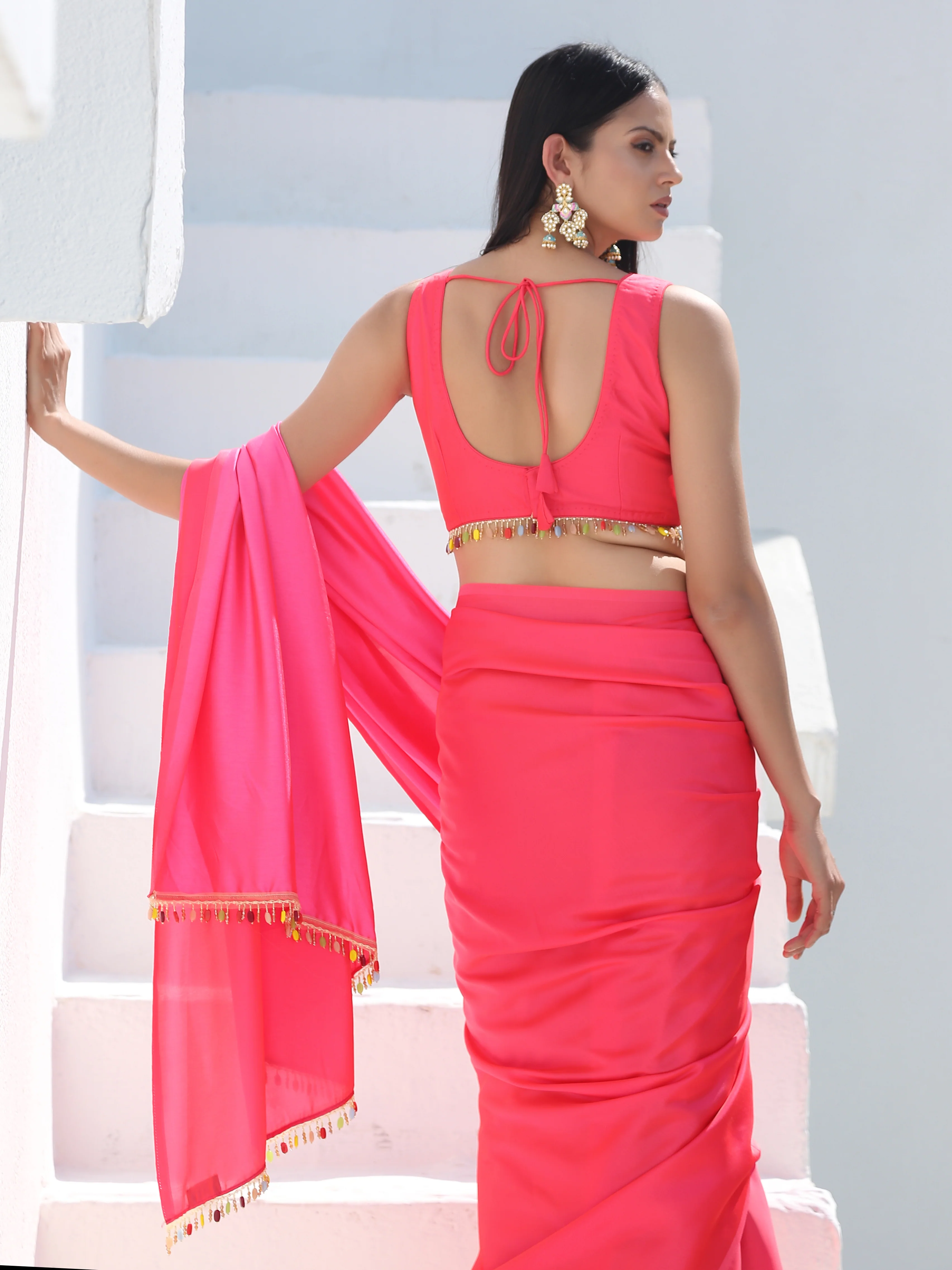 Recommendation - Loving the entire outfit you can have it all! Click & Shop SET I Neon Pink Saree with Multicolour Beaded Lace + Blouse + Belt