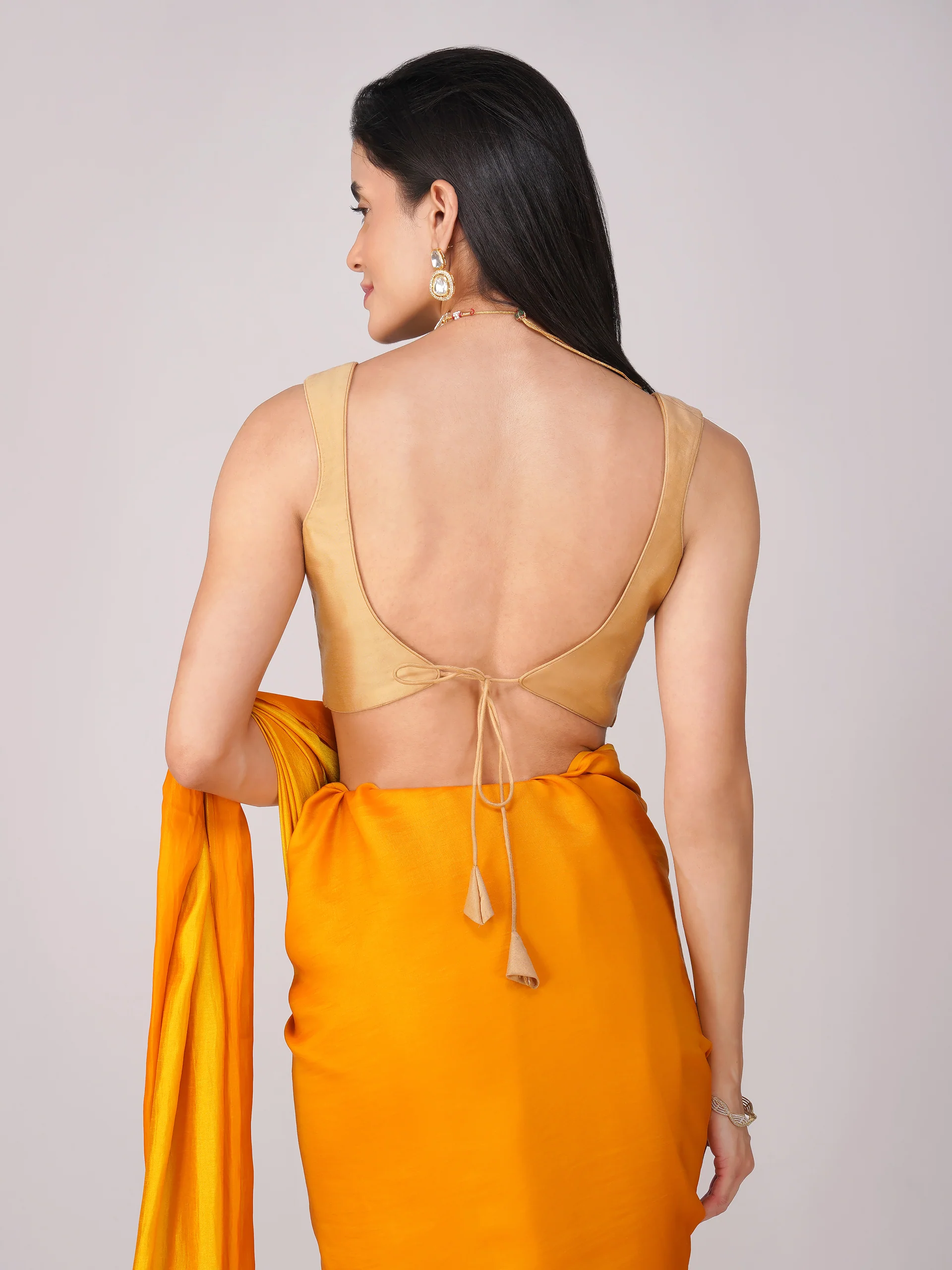 The back is finished with a sleek self-fabric tie-up closure for a customizable fit. The soft, tone-on-tone lining provides a clean interior feel while the light padding ensures shape and comfort without the need for additional layering. Subtle in hue yet strong in presence, this blouse acts as the perfect neutral base for bold drapes or monochrome minimalism.