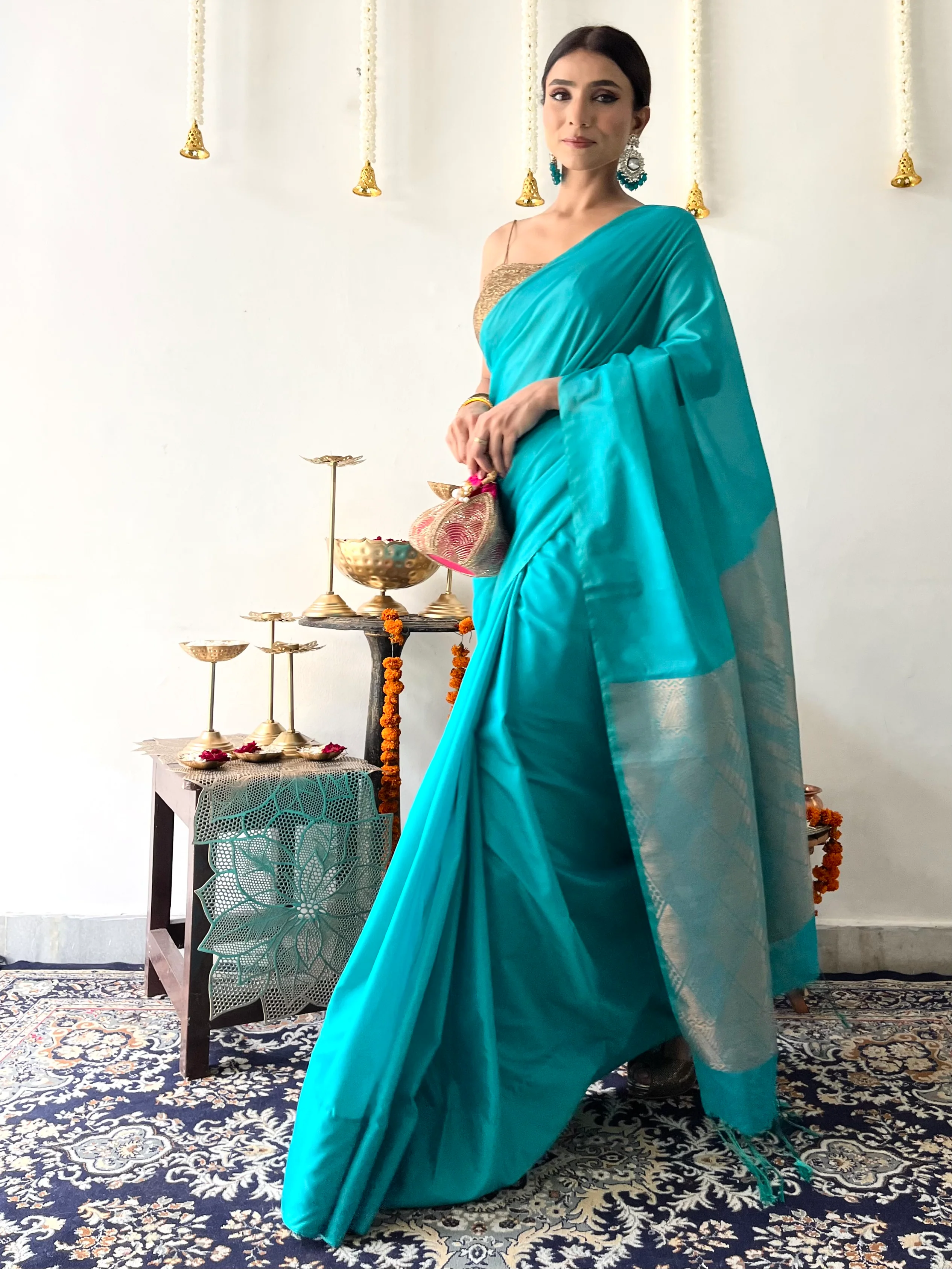 Pair with traditional jhumkas, gold bangles, and a statement clutch for a festive-ready ensemble.