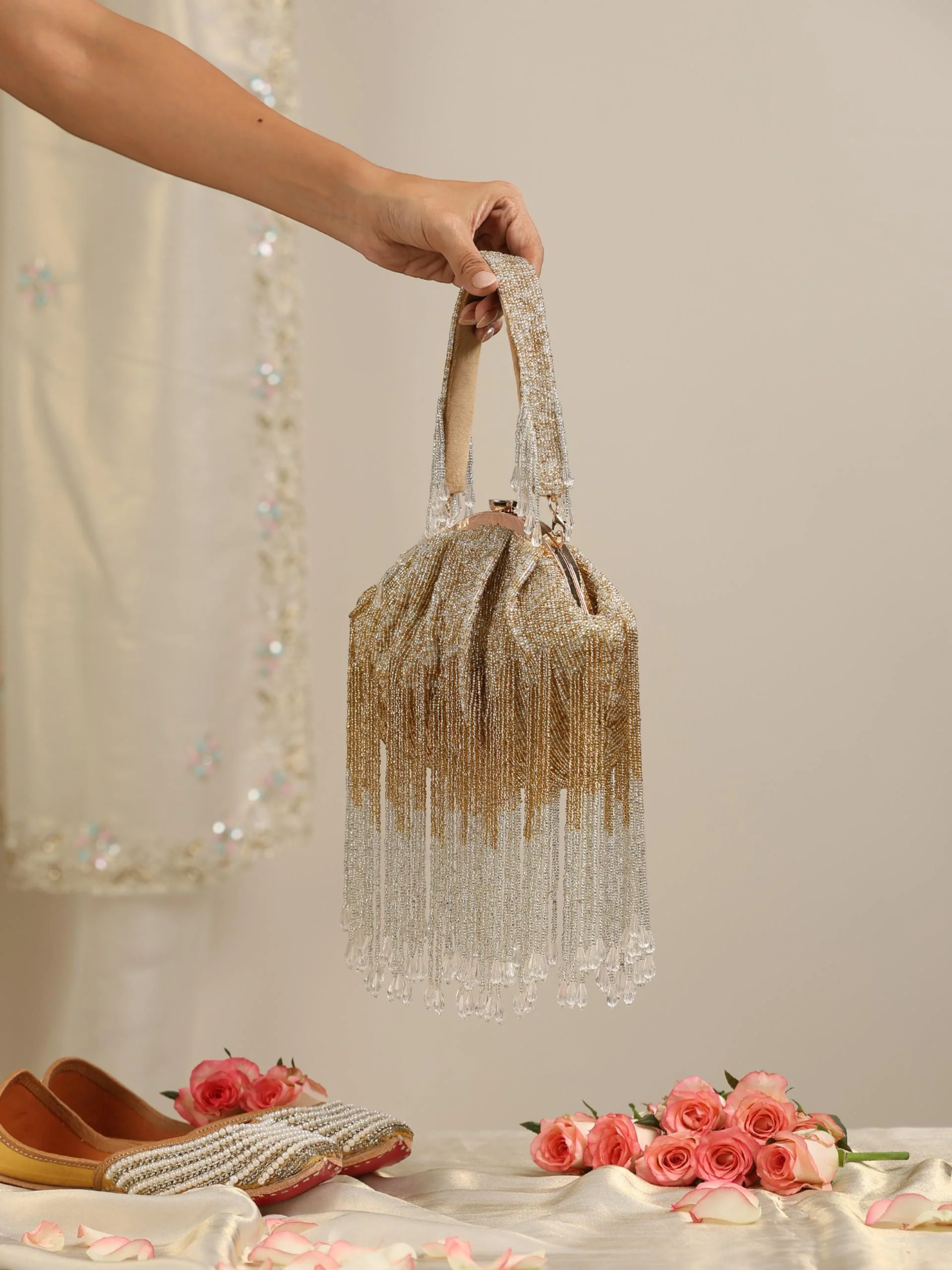 The Gold and White Long Beaded Clutch Bag is ideal for high-profile events such as weddings, galas, or upscale parties. Its elegant color palette and detailed beadwork make it a perfect match for formal attire, including evening gowns, cocktail dresses, or bridal wear in complementary colors such as gold, white, or champagne. This clutch adds a touch of opulence and sophistication to any elegant outfit.