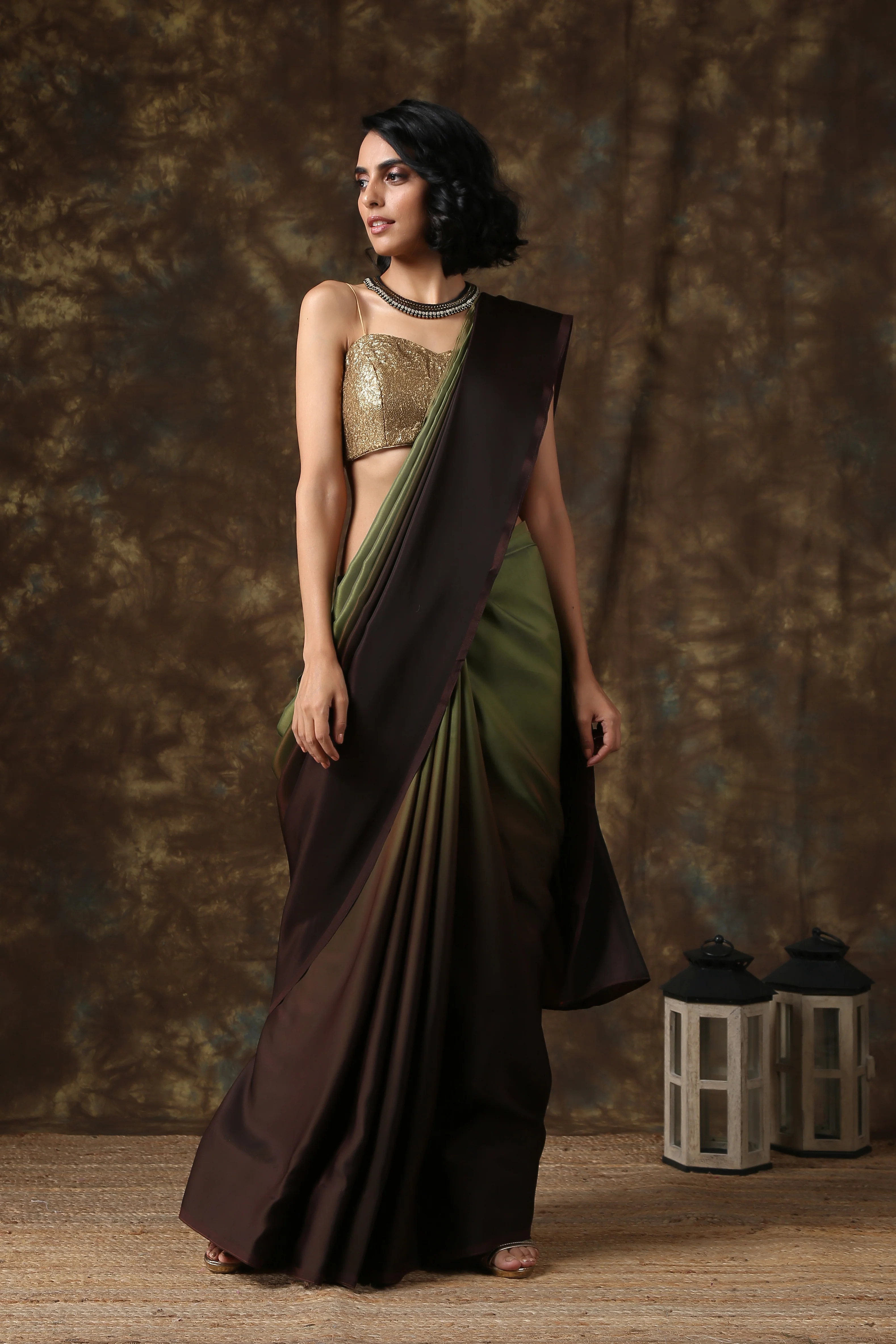 Dark Chocolate & Green Satin Ombre' Saree