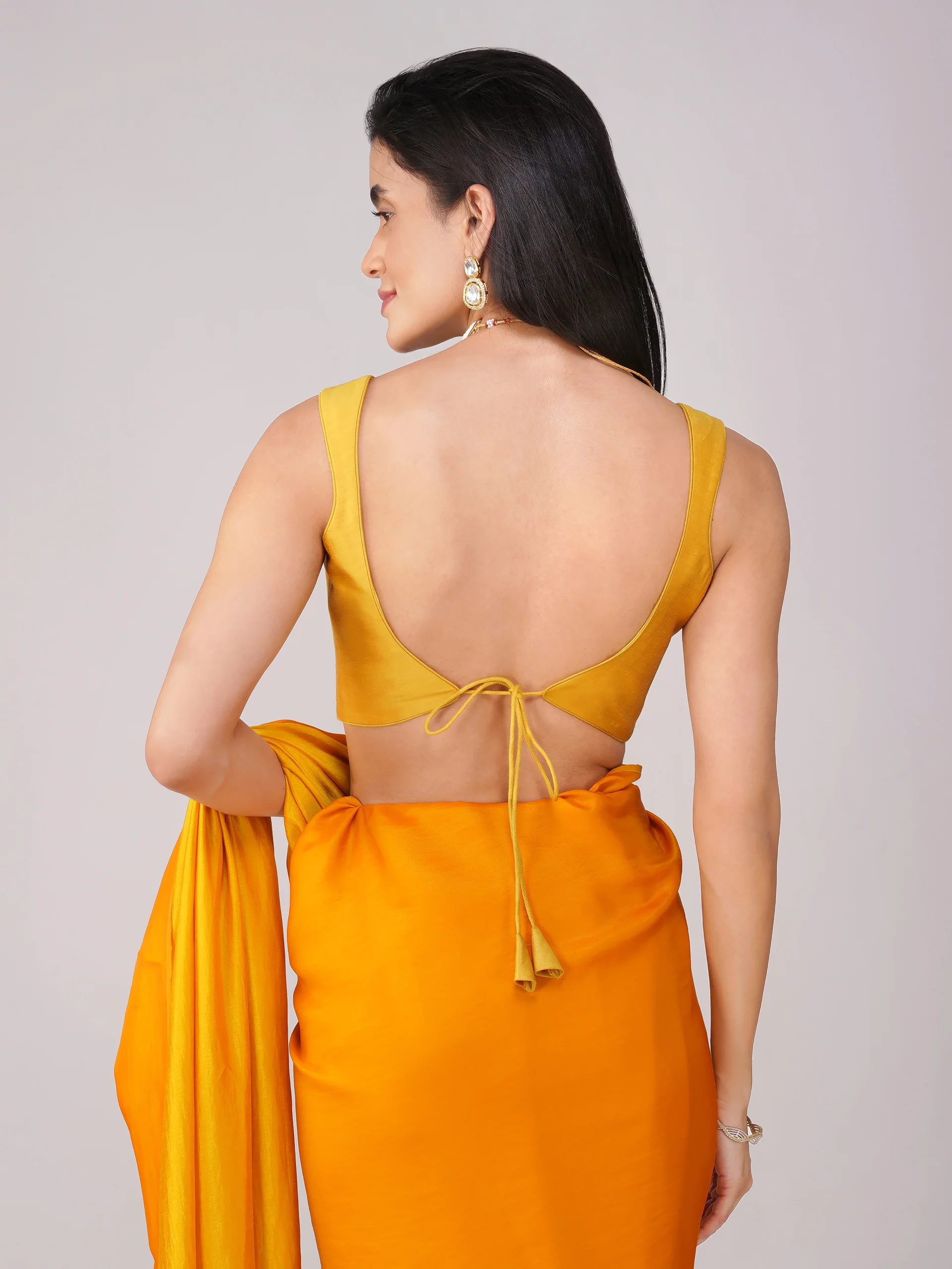 The deep back is finished with a tonal tie-up closure, allowing adjustable ease and a flattering drape across the back. Light built-in padding offers soft support and shape, eliminating the need for innerwear. Lined in a matching hue for a seamless finish, the blouse stays elevated inside and out.