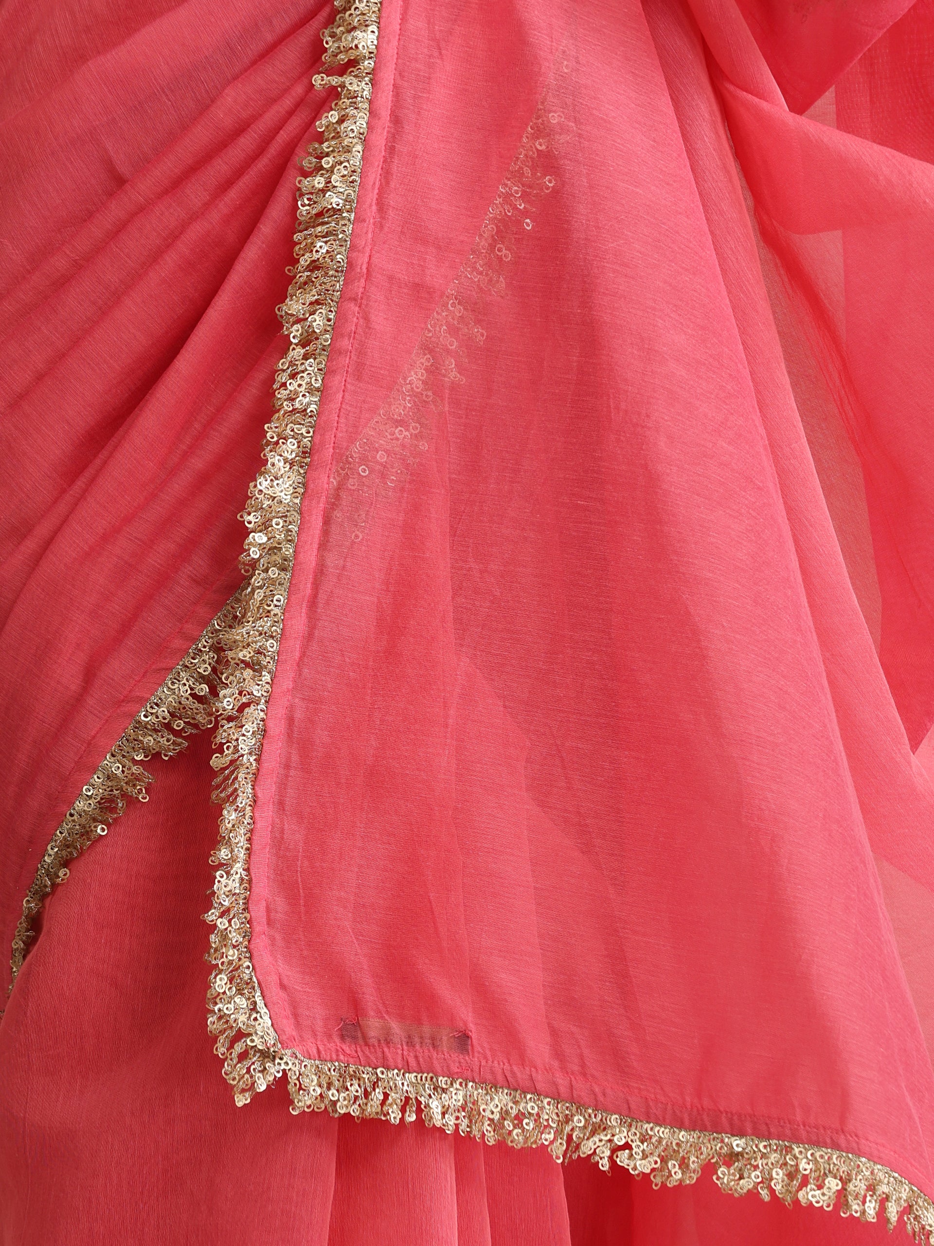 Delicate, airy, and effortlessly festive — this pink cotton Chanderi saree is a celebration of classic Indian craftsmanship. The saree’s sheer elegance is highlighted by a finely hand-embellished gold border, making it the perfect pick for daytime festivities, pujas, or intimate celebrations.