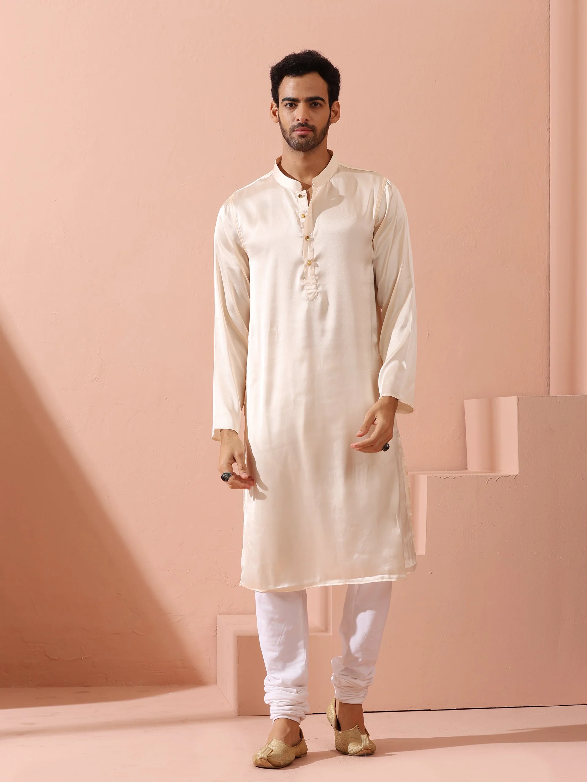 Rose Cream Satin Kurta with Gold Buttons
