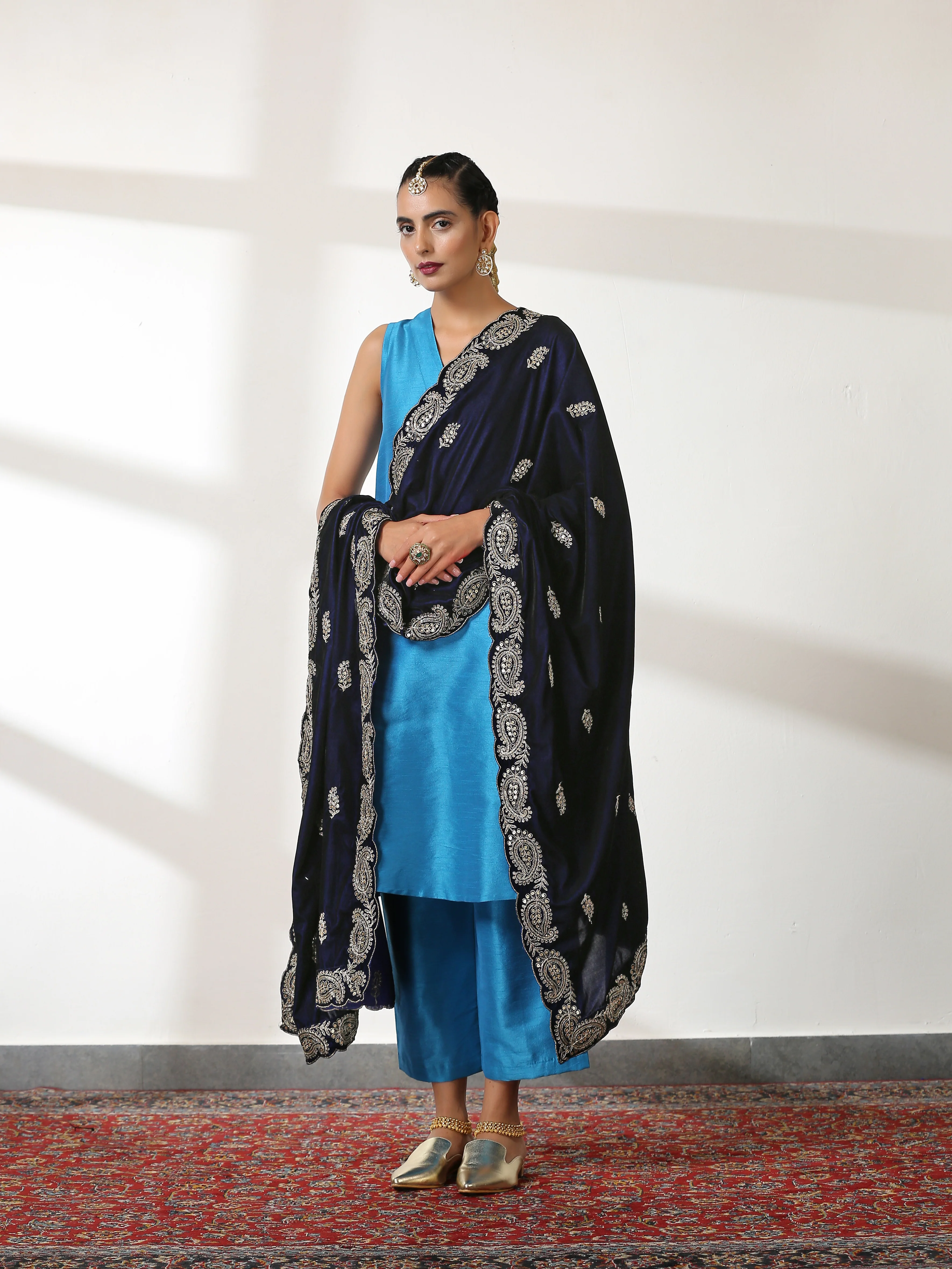 Teal Green V-neck sleeveless kurta with straight fit pants in dupion silk fabric. This Clean, classic silhouette is perfect for many occasions. You can pair with the Midnight jacket or Shawls to contrast