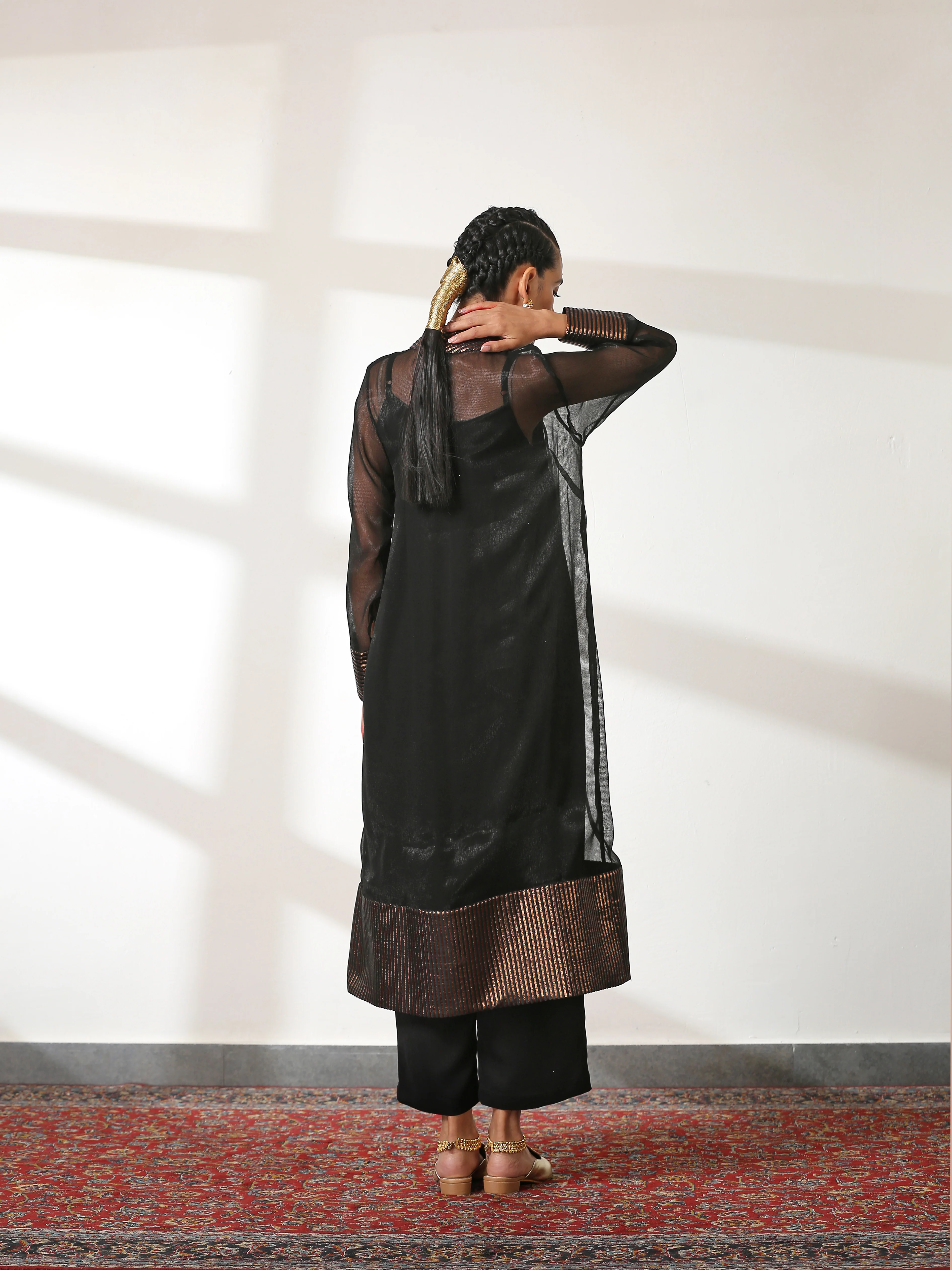 1) Jacket - Shimmer chiffon black with black & bronze stripe woven stripe. Single button opening which you can open or close - Own your style!