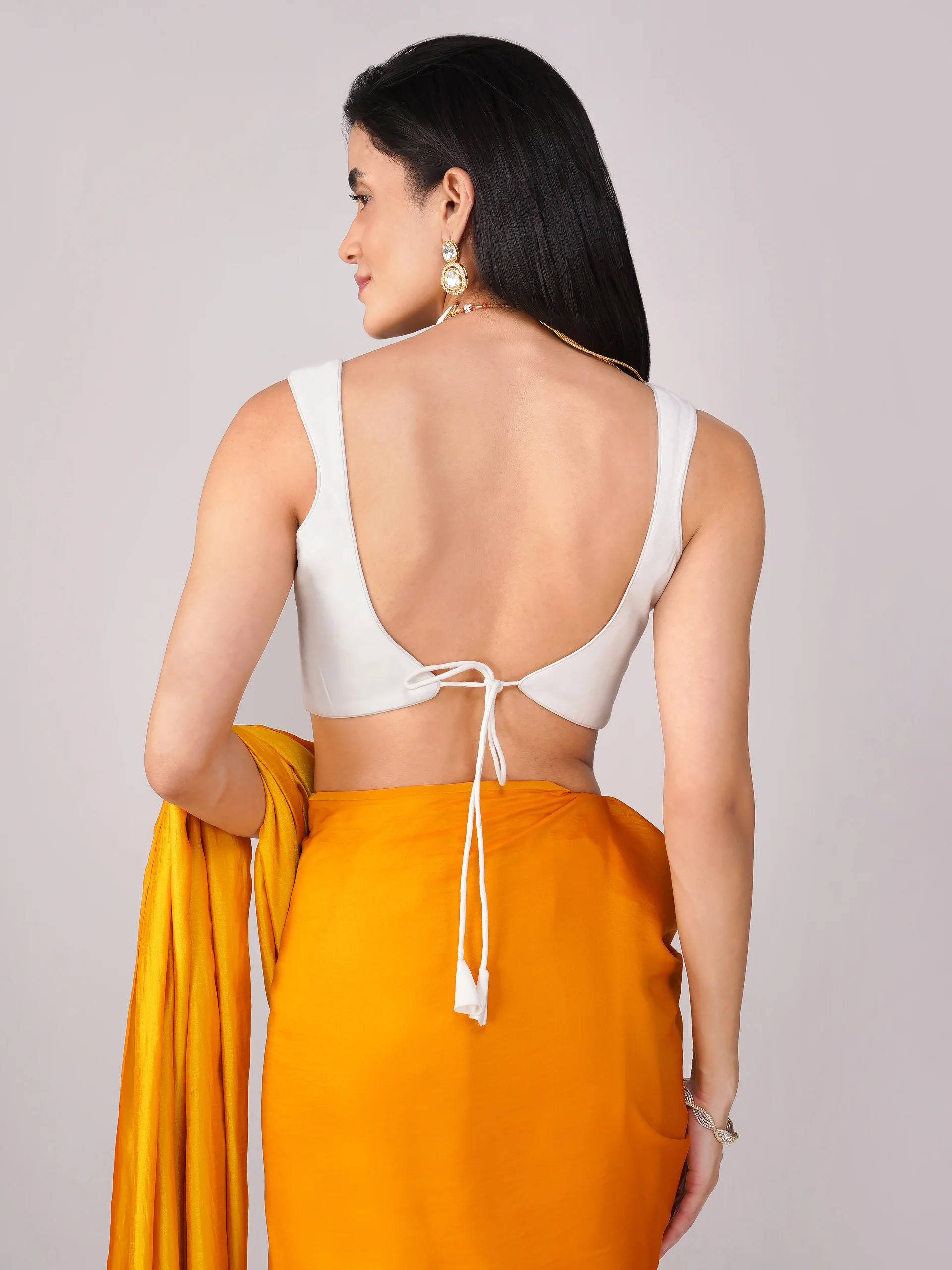 The deep back is secured with a tonal self-fabric tie-up, offering flexibility and finesse in fit. Fully lined in matching white and lightly padded for ease, it ensures a smooth finish inside and out — no layering required. Whether styled traditionally or as part of a fusion look, this blouse brings quiet luxury to every ensemble.