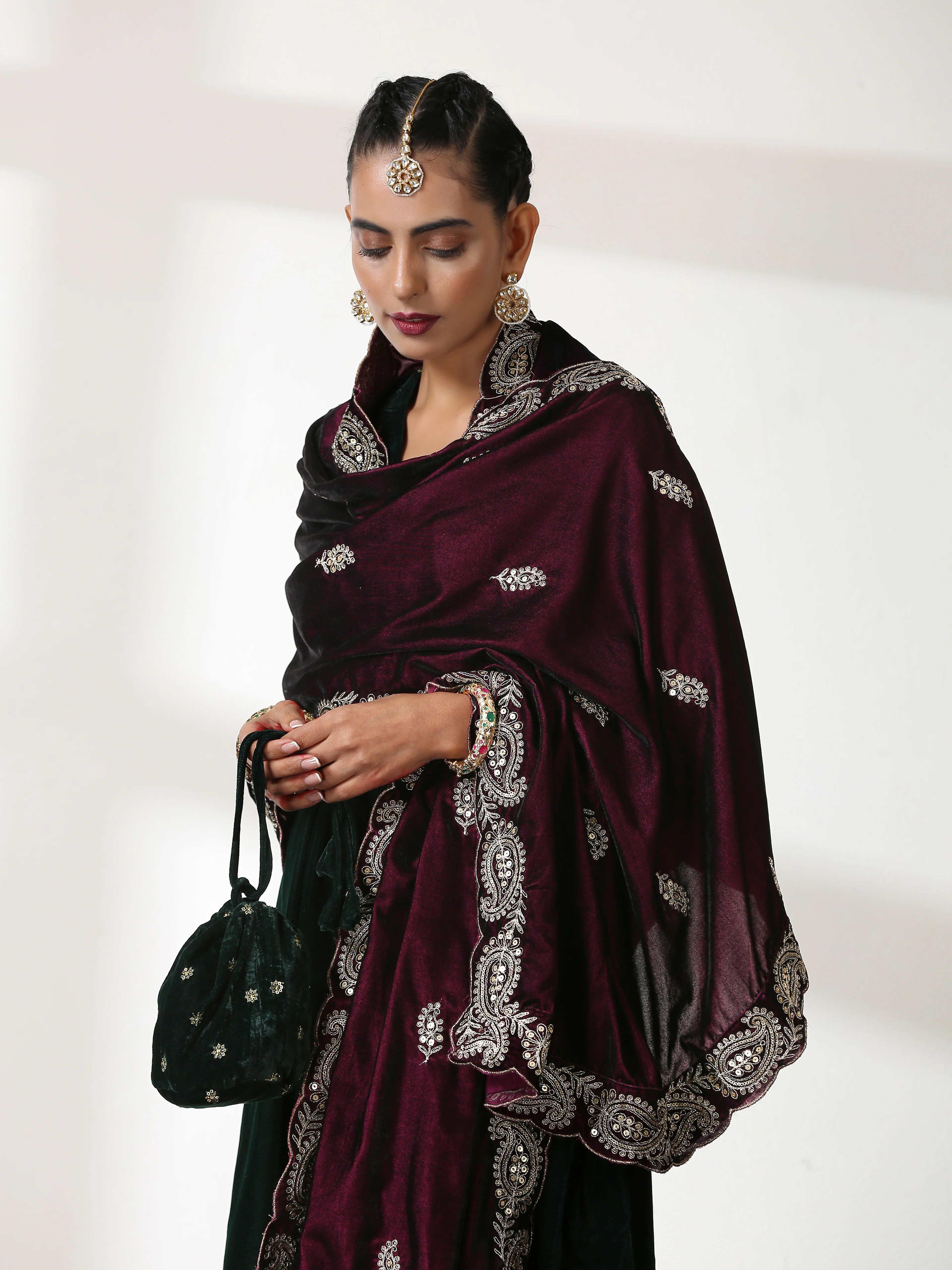 The wine shawl is made from velvet fabric with the finest surface embellishment, machine work, by skillful artisans of Swtantra.