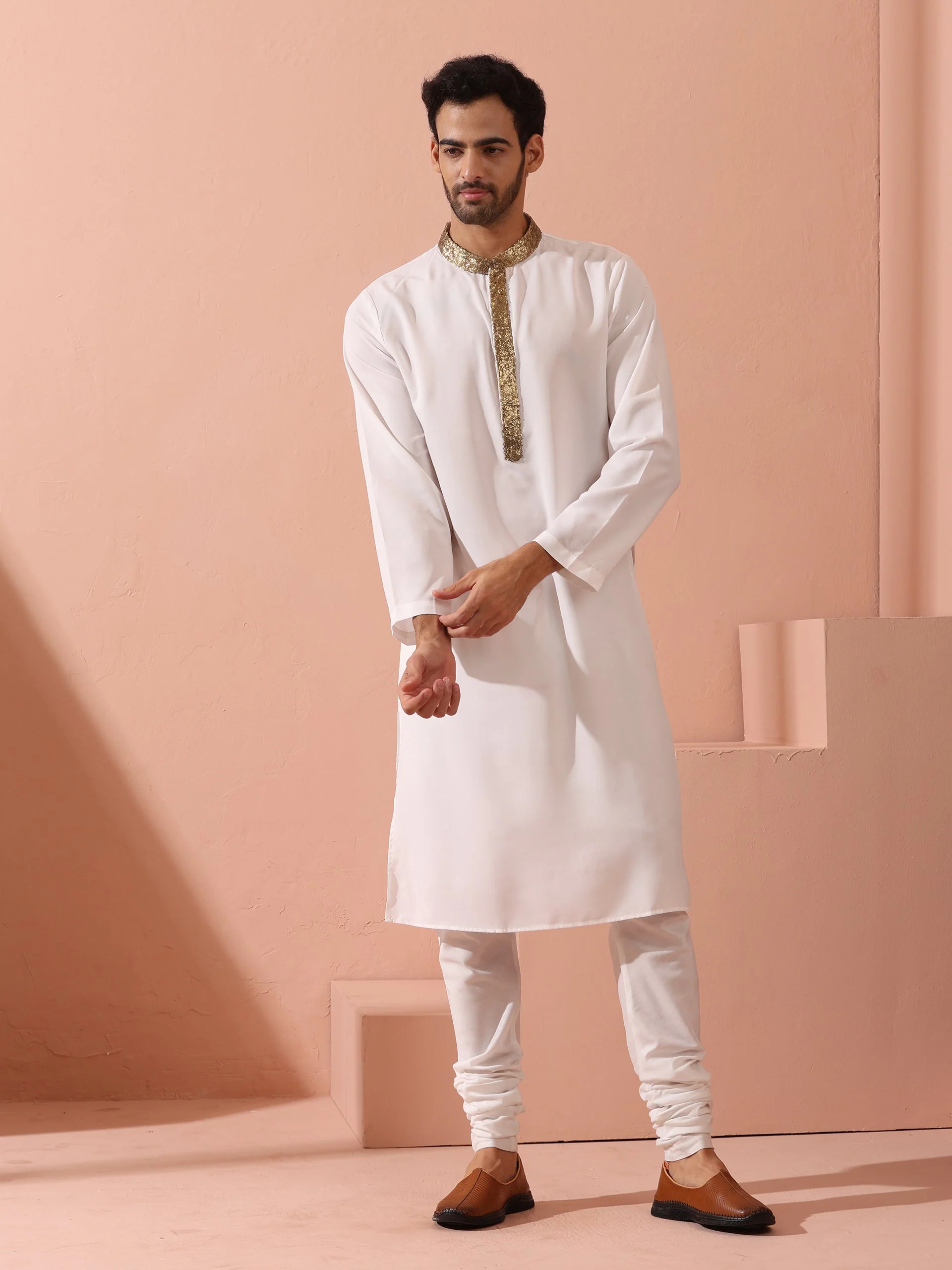 White & Gold Sequin Crepe Kurta with Hidden Placket